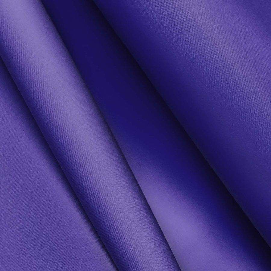 Nuestra tela base es el Poliester Reciclado Deportivo - Basic, compuesta por un 93% de poliéster y un 7% de elastómero, con un gramaje de 145 gr/m2 y un ancho de tela de 145 cm. Su color liso impreso es una combinación de morado y azul purpúreo con un CMYK de 97-97-5-1. Este color evoca a la libertad y la creatividad, ideal para prendas deportivas o de baño. Combina muy bien con colores neutros como el blanco o el beige, así como con tonos grises o negros para un contraste más fuerte.