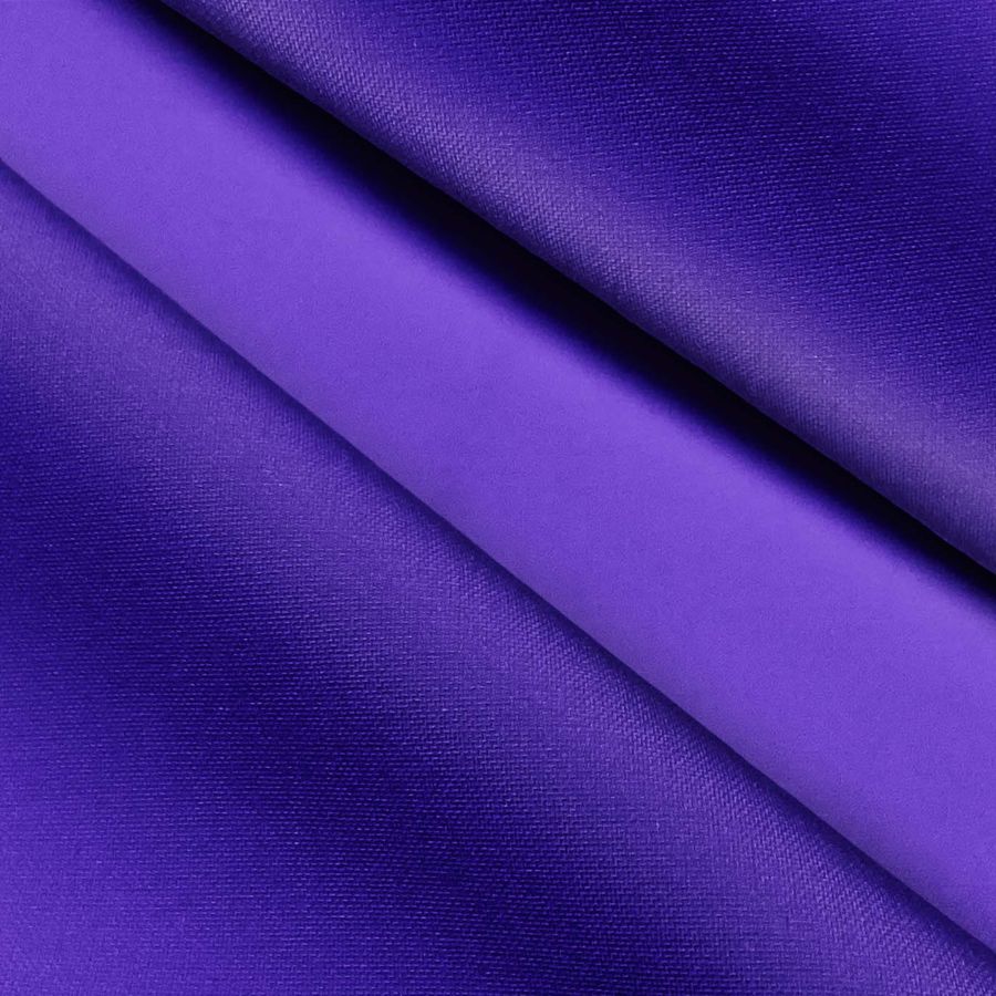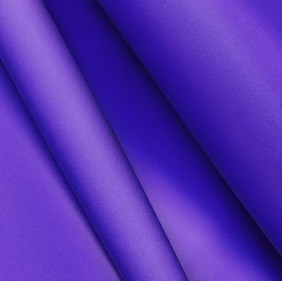 La tela base es el Poliester Reciclado Deportivo - Basic, con una composición de 93% poliéster y un 7% de elastómero. Es una tela suave al tacto y con una textura lisa. El color impreso es morado-azul violáceo, con una tinta cyan de 87 y una magenta de 83, sin tintas yellow ni black, lo que indica un color fuerte y brillante. Combina bien con verdes, grises y negros.