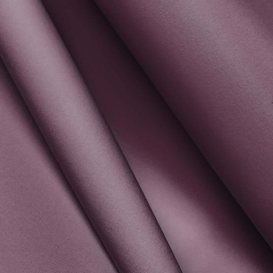 La tela base es Poliester Reciclado Deportivo - Basic de 145 gr/m2, compuesta por 93% poliéster y 7% elastómero, con un ancho de 145 cm. El color liso impreso tiene un tono morado berenjena, con una tinta cyan de 56, magenta de 71, amarillo de 42 y negra de 41, resultando en un CMYK de 56 71 42 41. La combinación de estos colores secundarios crea un tono profundo y vibrante, que combina muy bien con colores neutros como el blanco y negro, así como con tonos metálicos como el oro y el plateado.