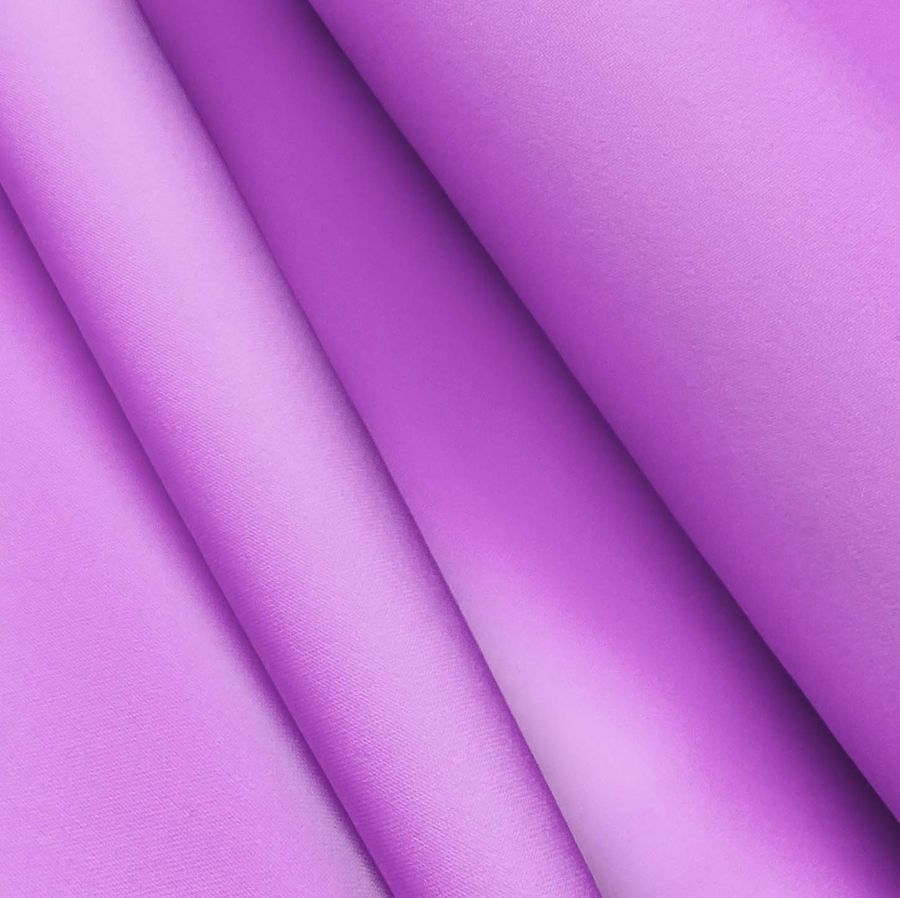 La tela base es una Poliester Reciclado Deportivo - Basic de 145 gr/m2 y un ancho de 145 cm, compuesta por 93% poliéster y 7% elastómero, de textura suave y lisa al tacto. El color liso impreso es Morado Heliotropo, con una combinación de tintas Cyan al 38% y Magenta al 58%, sin usar Tinta Yellow ni Tinta Black, lo que proporciona un acabado brillante y vivo. La tela está impresa con el color liso a una sola cara por impresión digital textil.