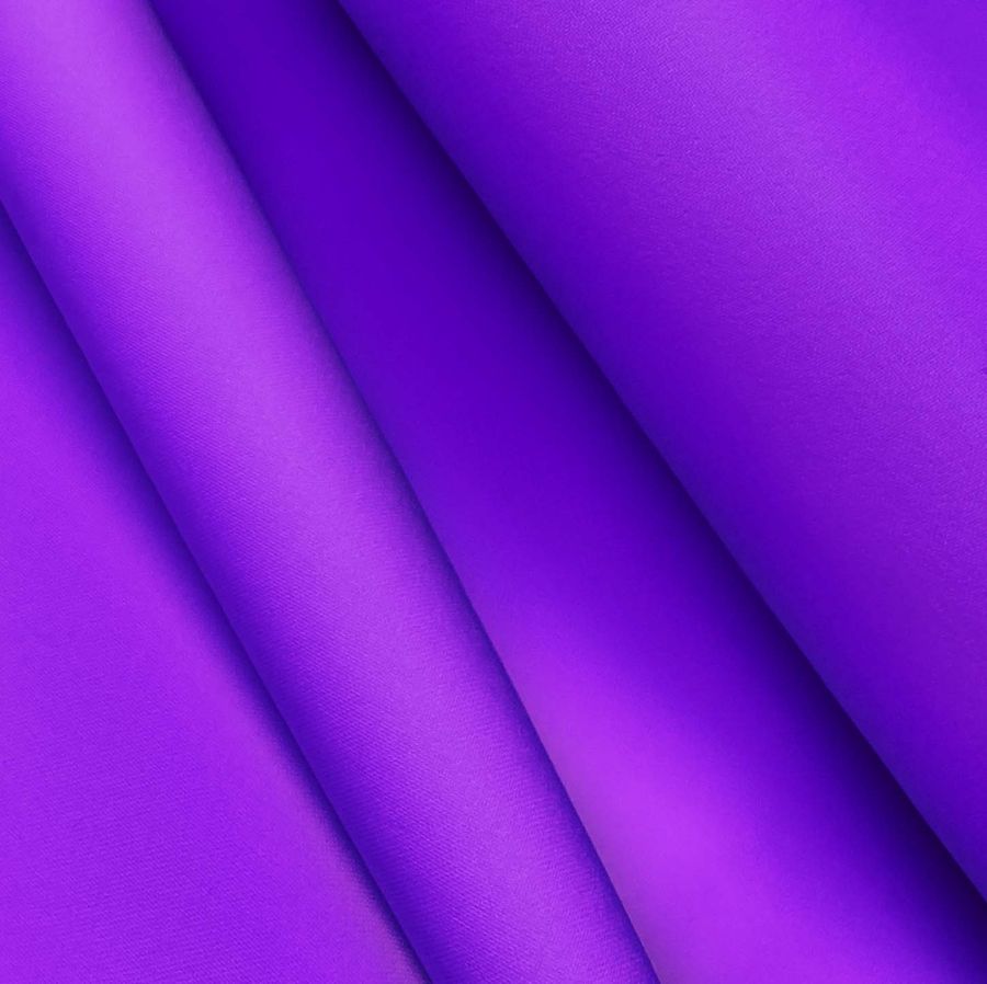 La tela base es Poliéster Reciclado Deportivo - Basic, compuesta por un 93% de poliéster y un 7% de elastómero con un gramaje de 145 gr/m2 y un ancho de 145 cm. El color liso impreso es un hermoso morado-violeta (CMYK: 80 80 0 0) que transmite tranquilidad y sofisticación. Simboliza la creatividad, la renovación y la elegancia y, al mismo tiempo, muestra estabilidad y confianza. El color combina perfectamente con colores neutros como el gris y el blanco, y con colores cálidos como el naranja y el amarillo.