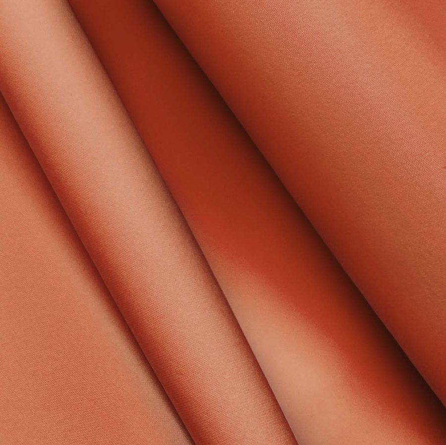 La tela base es un Poliéster Reciclado Deportivo - Basic con una composición de 93% de poliéster y 7% de elastómero, con un gramaje de 145 gr/m2 y un ancho de 145 cm. El color liso impreso es un vibrante tono de naranja, Golden Gate, compuesto por una combinación de tintas Cyan, Magenta, Yellow y Black en un CMYK de 19 75 84 8. El color secundario refleja energía, esperanza y vitalidad, combinándose armoniosamente con otros colores cálidos como el amarillo y el rojo, colores de telas ideales para prendas deportivas y de baño.