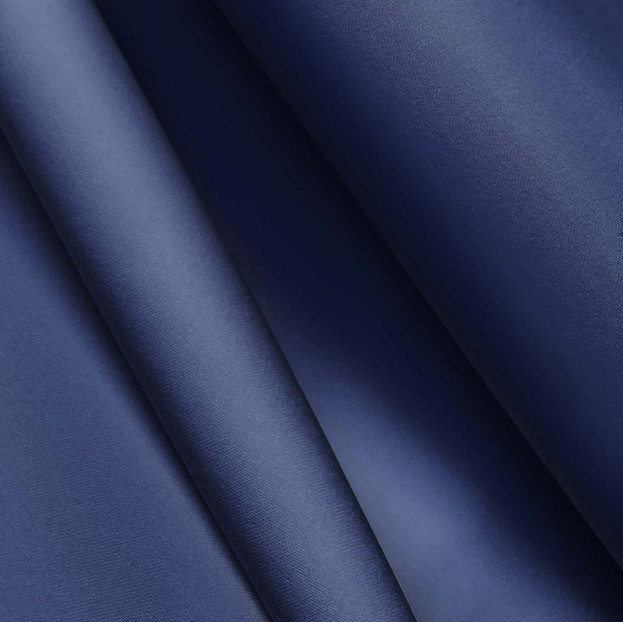 La tela base es el Poliéster Reciclado Deportivo - Basic, compuesta por un 93% de poliéster y un 7% de elastómero, con un gramaje de 145 gr/m2 y un ancho de 145 cm. El color liso impreso en la tela es un azul marino profundo, con una combinación CMYK de 100 88 38 35. Esta tonalidad representa la estabilidad y la profundidad de los mares, evocando una sensación de tranquilidad y confianza. El color azul marino profundo combina armoniosamente con tonalidades claras y oscuras, como grises, blancos, beiges y marrones, dándole al conjunto un toque de elegancia y sofisticación.