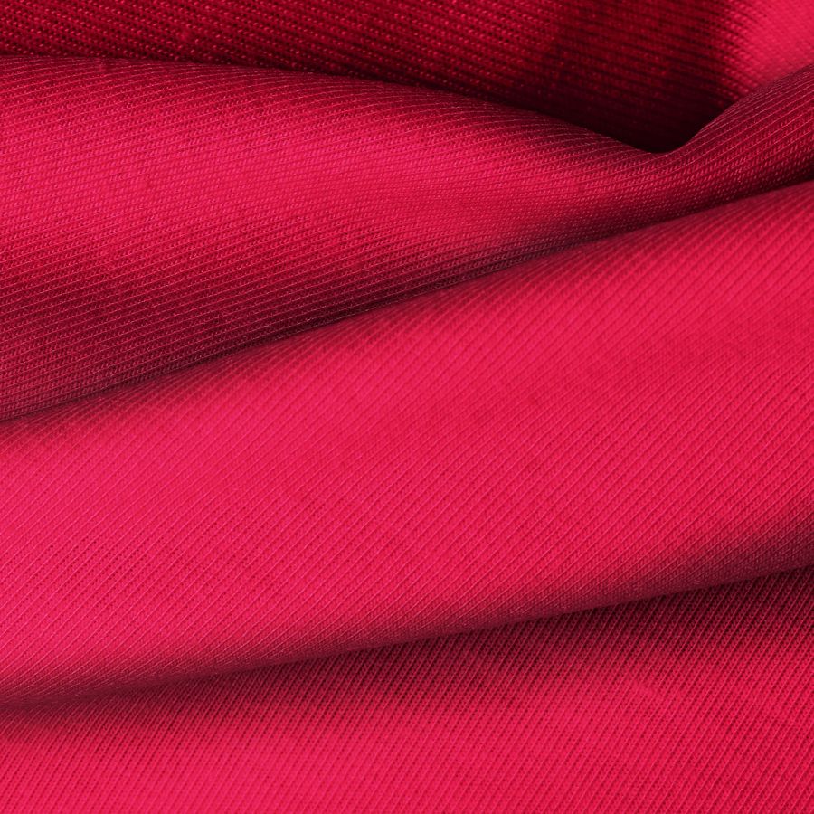 La tela base Vanity en Punto Camiseta es de color rojo vino tinto, con una composición de 95% poliéster y 5% elastómero. El color se obtiene con una combinación CMYK de 12 100 73 3, lo que genera un tono profundo y elegante. Este color se combina especialmente bien con tonos neutros como blanco, gris y negro, así como con colores cálidos como naranja y amarillo.