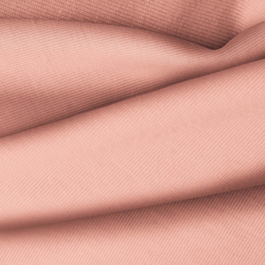 La tela base es Punto Camiseta - Vanity de composición 95% POLIÉSTER, 5% ELASTÓMERO. El color liso impreso es Rosa Melocotón con un CMYK de 0 53 42 0, que combina de manera simbólica la delicadeza del rosa con la calidez del melocotón. Se complementa especialmente con tonos neutros como blanco, beige o gris.