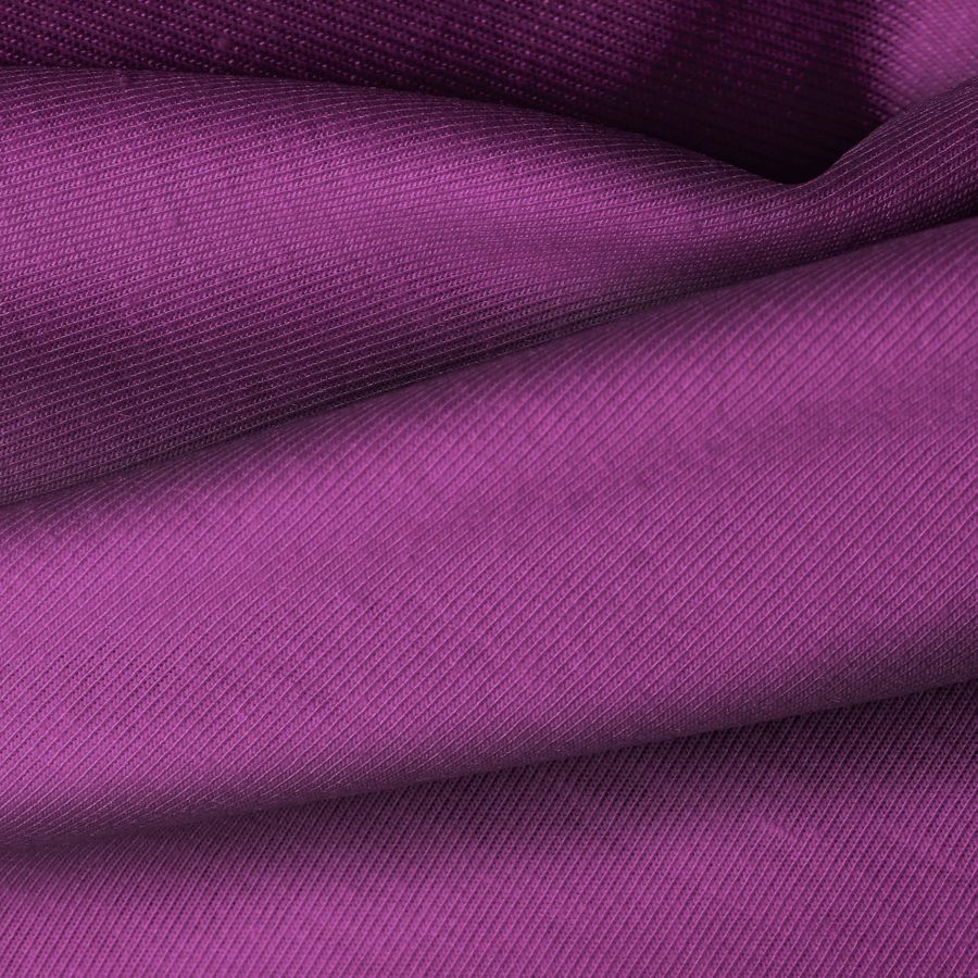 La tela base es Punto Camiseta - Vanity, con un color liso impreso en tonos Morado y Bizantino, con una combinación de tinta Cyan: 62, Magenta: 95, Yellow: 26 y Black: 17. Este color secundario se destaca por su intensidad y profundidad, combinando perfectamente con tonos neutros como blanco o negro, así como con colores complementarios como amarillo o verde.