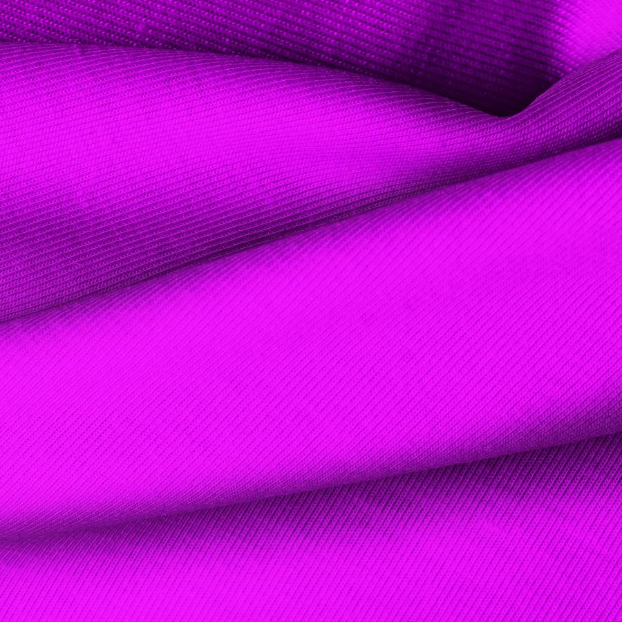 La tela base Punto Camiseta - Vanity es de color Morado Flox, con una composición de 95% POLIÉSTER y 5% ELASTÓMERO, reflejando un CMYK de 53 80 0 0. Este color secundario aporta un toque vibrante y llamativo, ideal para prendas de moda que buscan destacar. Combina muy bien con colores neutros como blanco y gris, así como con tonos más fuertes como el fucsia o el negro.