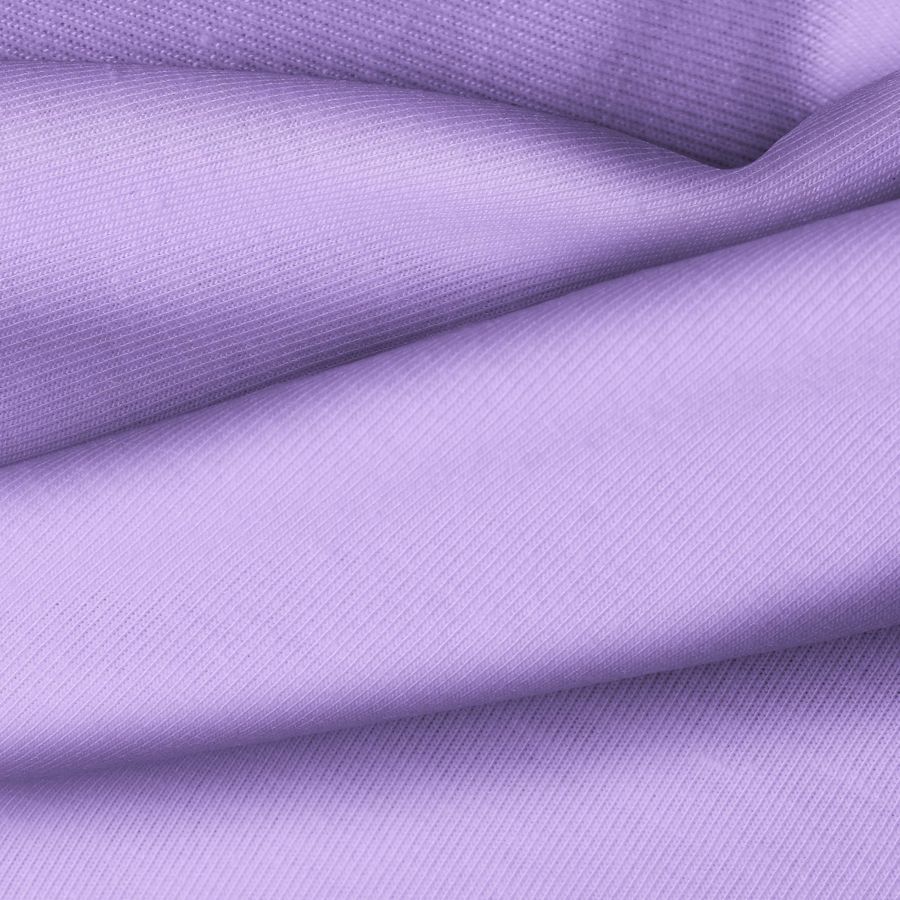 La tela base es un Punto Camiseta de color morado suave, con un CMYK de 41 48 0 0. Este color transmite tranquilidad y creatividad, ideal para prendas de moda y deportivas. Combina perfectamente con tonos neutros como blanco, negro y gris, así como con tonos pastel como rosa y azul claro.