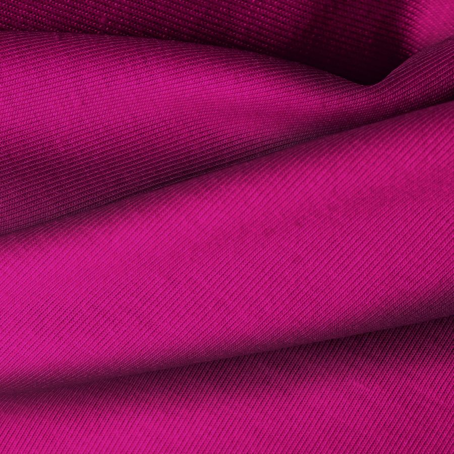 La tela base es Punto Camiseta - Vanity, de color liso impreso en tonos Morado y Rojizo con un CMYK de 33 100 28 25. Este color secundario simboliza la pasión y la creatividad, y combina especialmente bien con tonos neutros como el blanco, negro y gris. El tejido está impreso a una sola cara por impresión digital textil.
