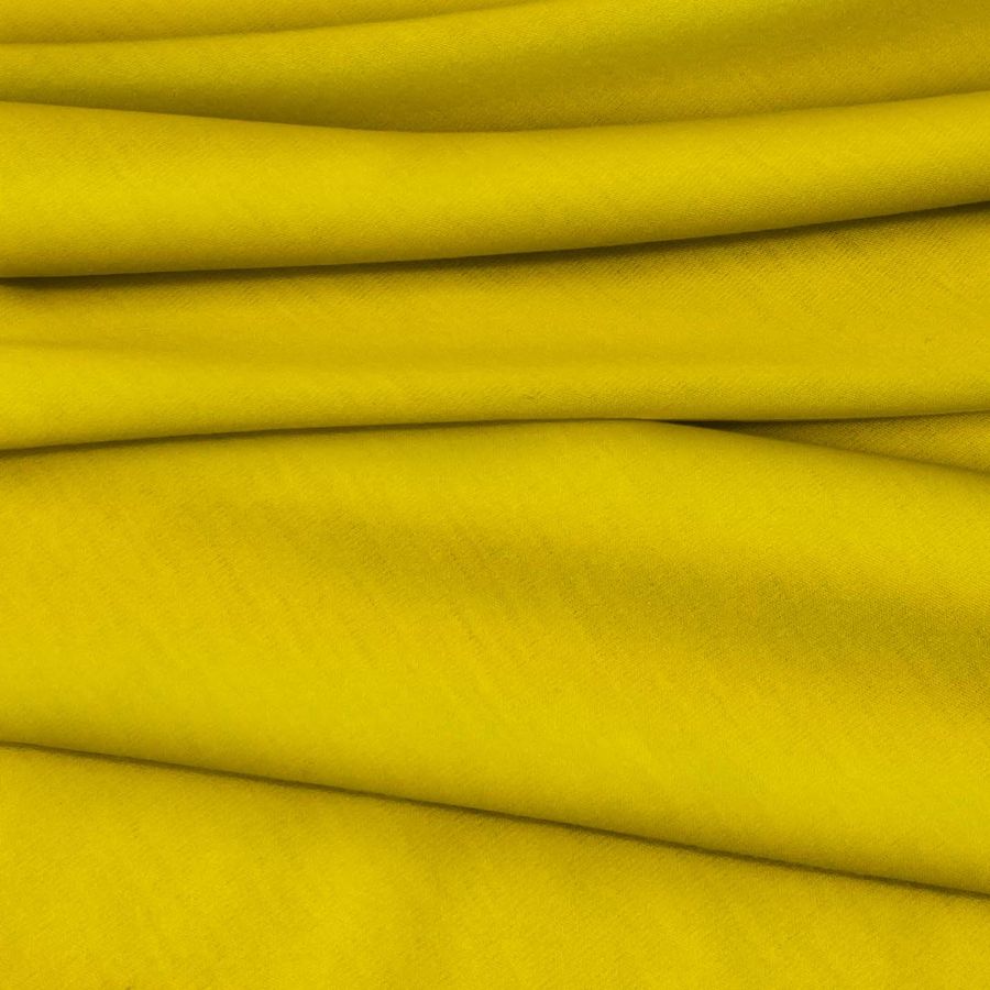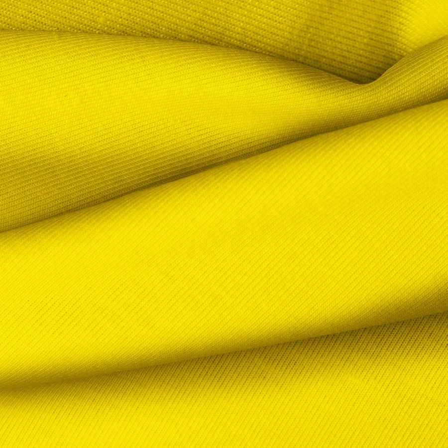 La tela base es Punto Camiseta - Vanity, de composición 95% POLIÉSTER y 5% ELASTÓMERO, con un color liso impreso en tono Amarillo Hansa (CMYK: 0 20 93 0), un amarillo brillante y vibrante que combina perfectamente con colores neutros como grises, blancos y negros.
