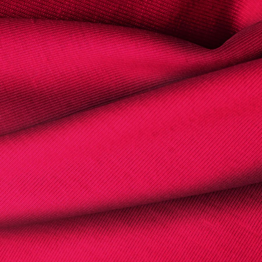 La tela base es Punto Camiseta - Vanity, de composición 95% POLIÉSTER y 5% ELASTÓMERO, con un gramaje de 185 gr/m2 y un ancho de 160 cm. El color liso impreso es Rojo Frambuesa, con una combinación de tintas Cyan: 15, Magenta: 100, Yellow: 74 y Black: 6 en el CMYK.