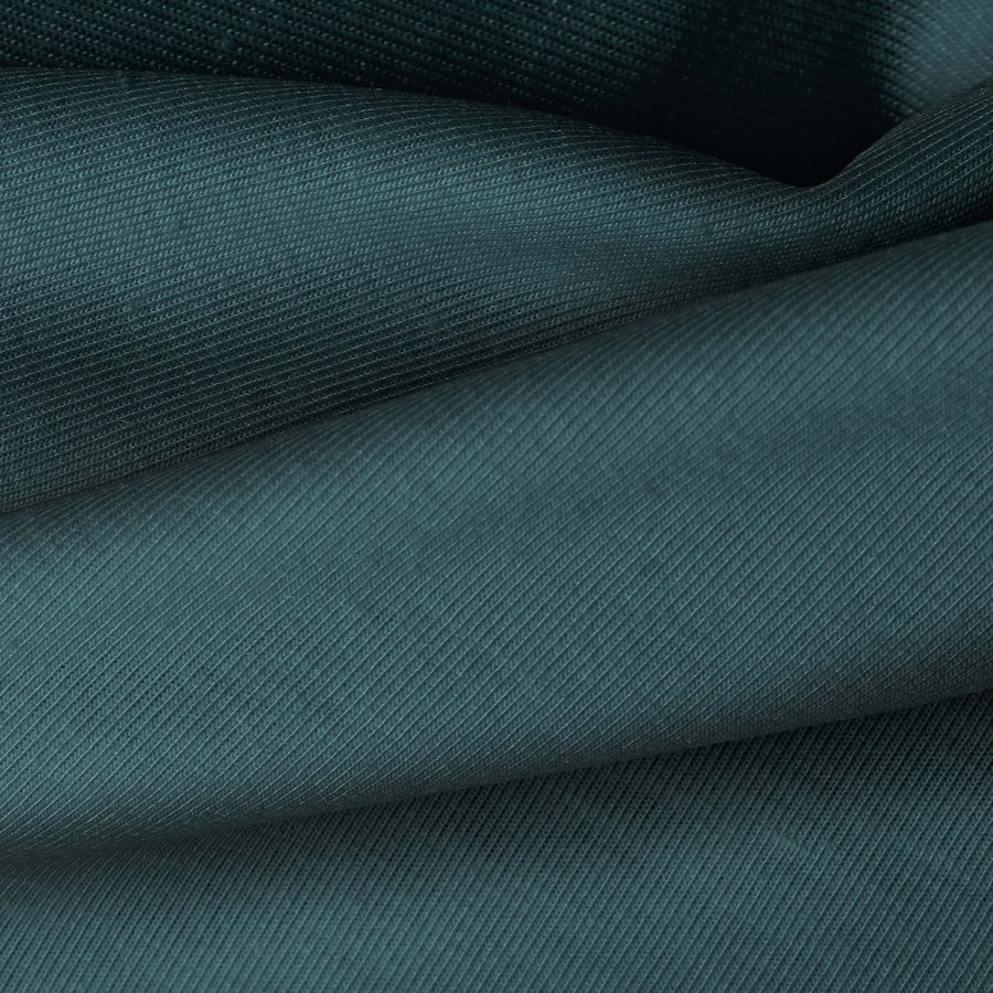 La tela base Punto Camiseta - Vanity es de punto, con una composición de 95% poliéster y 5% elastómero. El color liso impreso es Verde Mar Oscuro, con un CMYK de 84 54 55 59. Este color secundario simboliza la elegancia y la profundidad, combinando de manera ideal con colores neutros como blanco, negro y gris.
