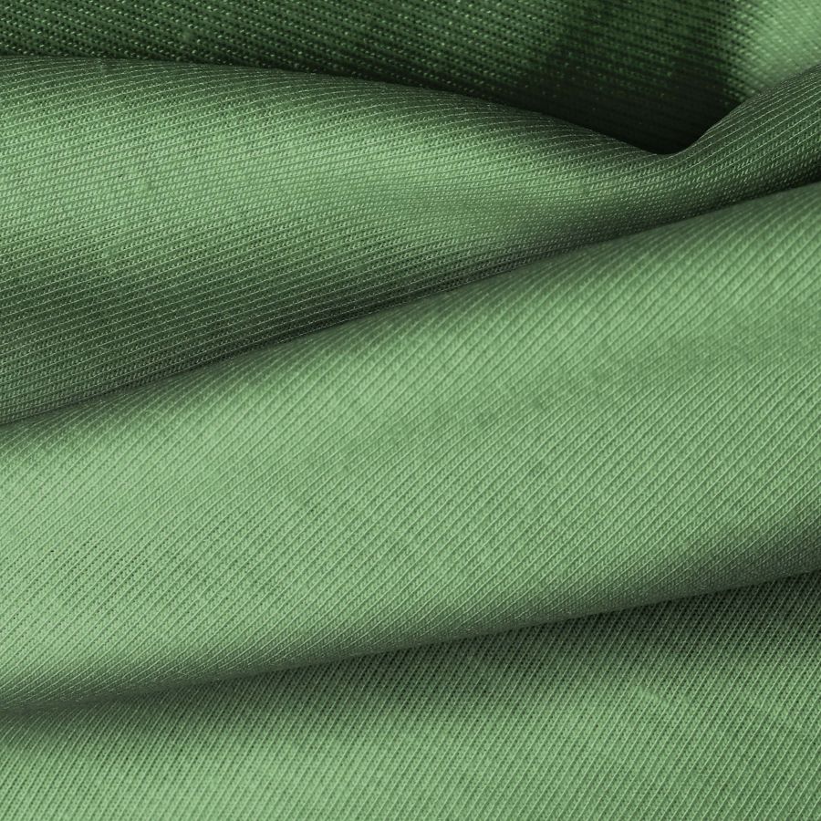 Las características generales de la tela base incluyen una textura suave y elástica, lo que la hace cómoda de llevar y se adapta bien al cuerpo. El color liso impreso en Verde Marchito añade un toque de originalidad y sofisticación a cualquier prenda confeccionada con este tejido.