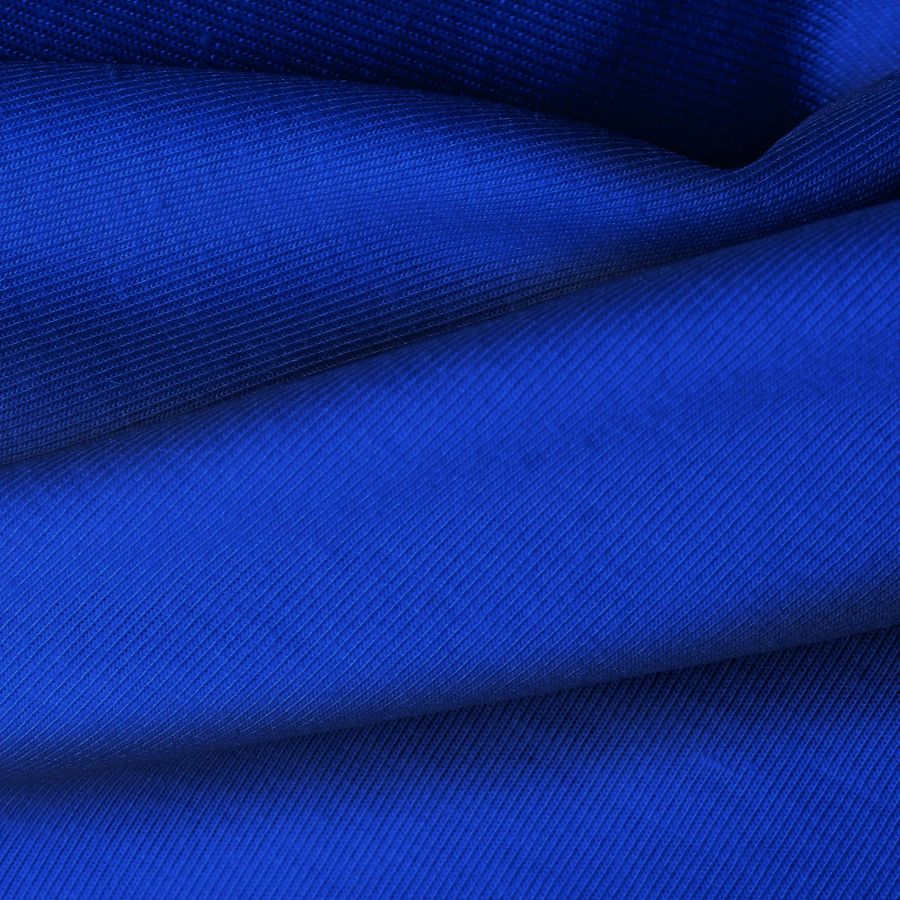 La tela base es el Punto Camiseta - Vanity en color Azul Europa, con un CMYK de 100 89 19 2. Este color azul profundo y vibrante simboliza la serenidad y la confianza, combinando perfectamente con tonos neutros como blanco, gris y negro, así como con tonos cálidos como el amarillo o el naranja.