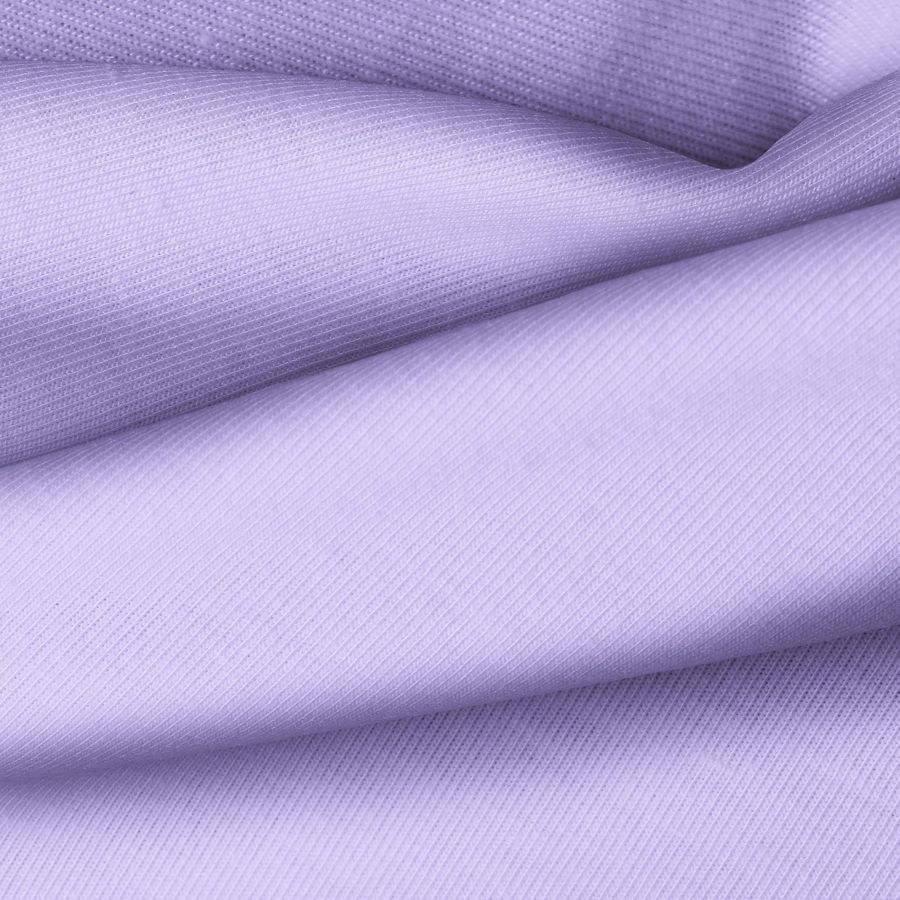 La tela base de la Punto Camiseta - Vanity es una tela de punto compuesta por 95% de poliéster y 5% de elastómero, con un gramaje de 185 gr/m2 y un ancho de 160 cm. El color liso impreso en esta tela es Azul Lavanda, con un CMYK de 35 37 0 0. Este color se caracteriza por ser una tonalidad suave y relajante que combina muy bien con colores neutros como el blanco, el gris o el beige, creando armonía y equilibrio en la pieza textil.