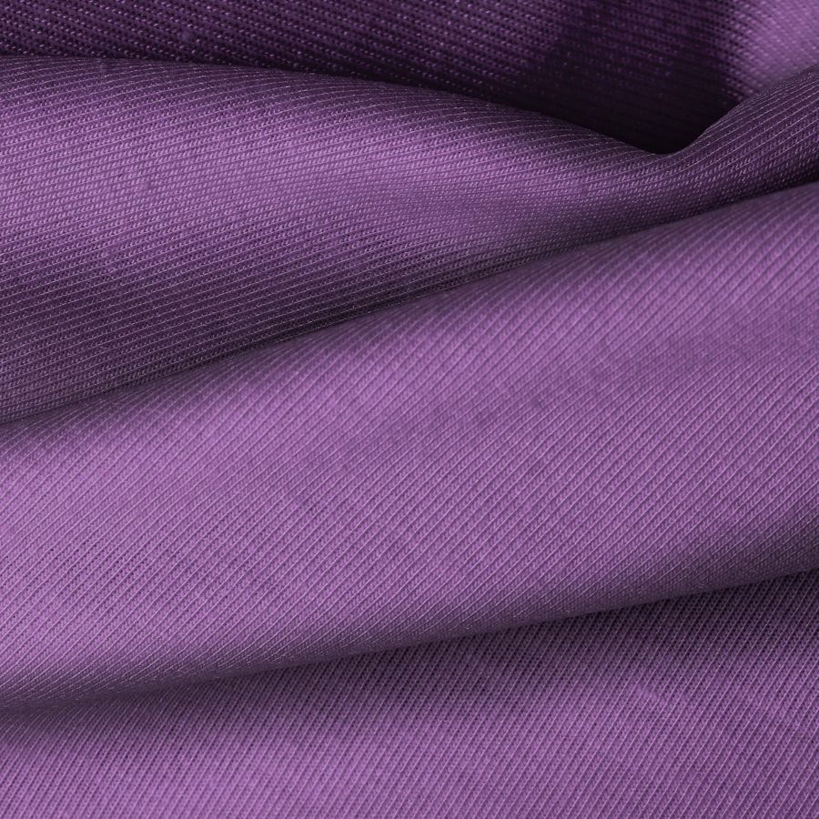 La tela base Punto Camiseta - Vanity es de composición 95% poliéster y 5% elastómero, con un gramaje de 185 gr/m2 y un ancho de 160 cm. El color liso impreso en esta tela es Azul y Lila, con un CMYK de 65 78 27 12. Este color secundario simboliza la calma y la creatividad, combinando a la perfección con tonos neutros como blanco y gris, así como con amarillo y verde para contrastar. La tela está impresa con este color liso a una sola cara por impresión digital textil.