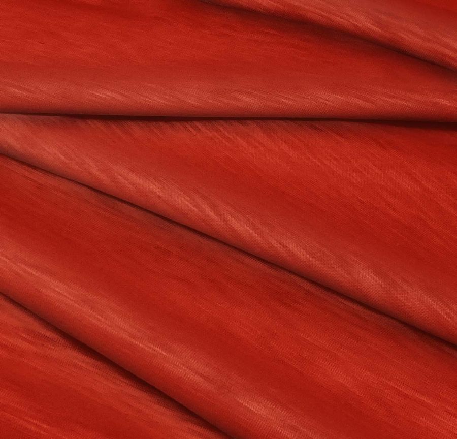 La tela base de la producción es la Punto Camiseta Jaspeado - Dubái, hecha de 100% poliéster y con un gramaje de 135 gr/m2 y un ancho de 160 cm. El color liso que se ha impreso en esta tela es un rojo ladrillo refractario con valores de CMYK: 23 97 100 19. La tela tiene una textura lisa y visual translúcida y jaspeada y su tacto es elástico. El color secundario impreso es un rojo ladrillo que simboliza la pasión y la energía. Este color es ideal para combinar con marrones, verdes y grises. Es importante destacar que la impresión se realiza por una sola cara mediante impresión digital textil.