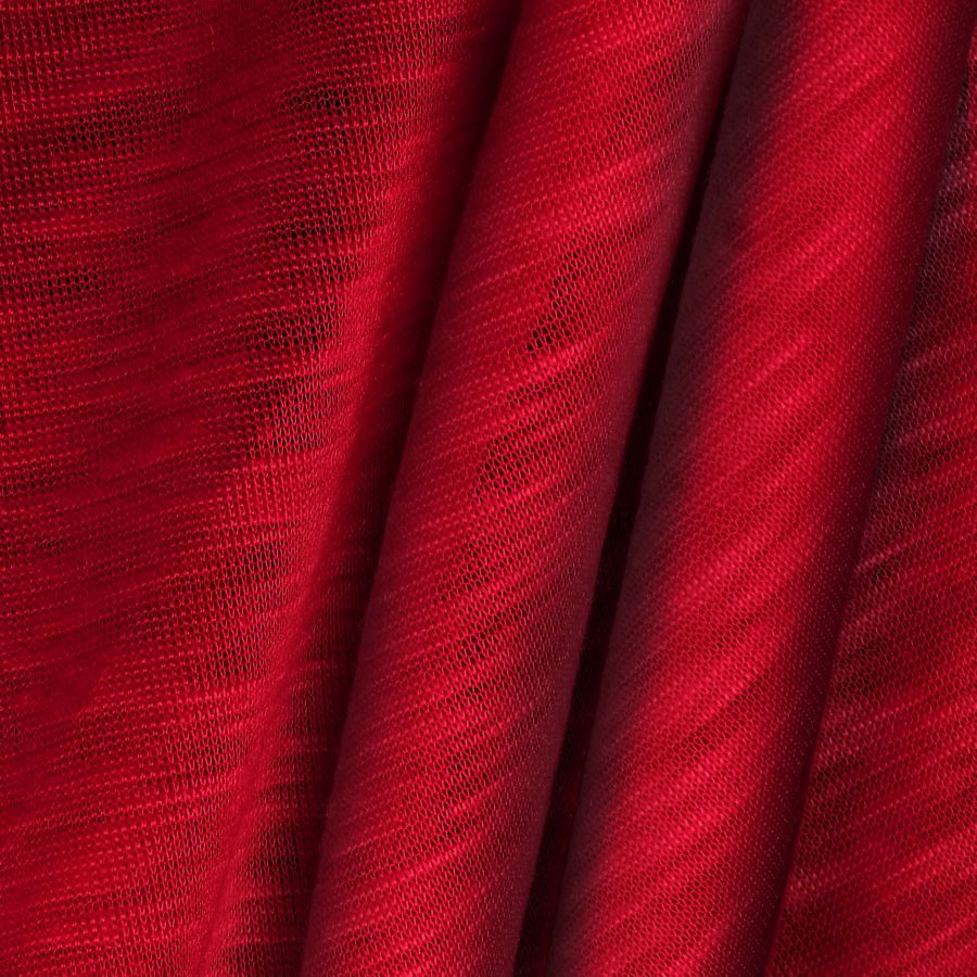 La tela base es Punto Camiseta Jaspeado - Dubái, de composición 100% poliéster, con un gramaje de 135 gr/m2 y un ancho de 160 cm. El color liso impreso en la tela base es Rojo Carmín, con una combinación de tinta Cyan, Magenta, Yellow y Black (CMYK) de 26, 100, 91 y 28, respectivamente. El color secundario es el magenta, que simboliza la pasión, el amor y la fuerza. Este color combina bien con el amarillo, el verde y el naranja, ya que son colores complementarios. La tela está impresa con el color liso a una sola cara por impresión digital textil, lo que significa que no es un tejido tintado sino impreso por una sola cara.