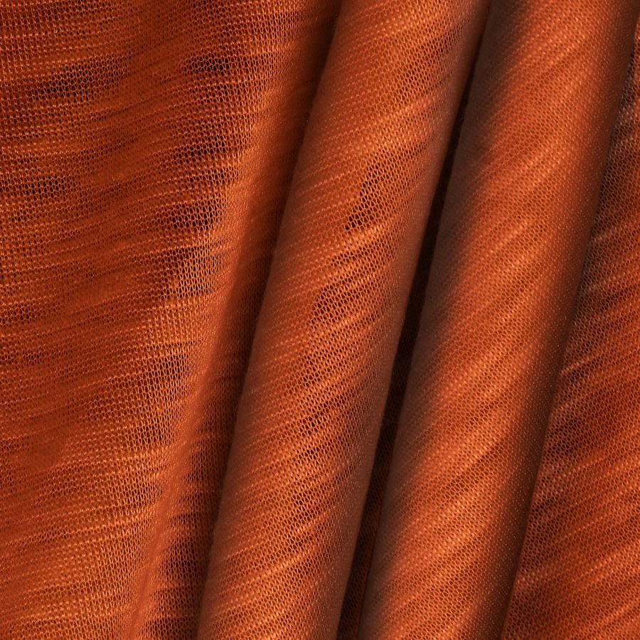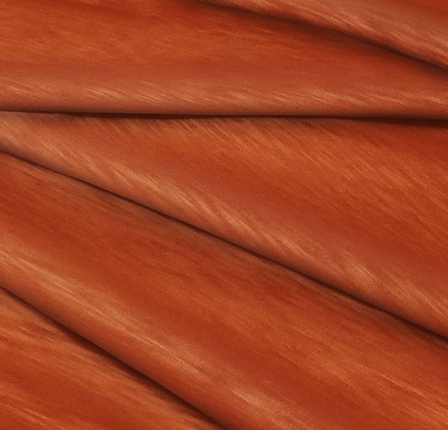 La tela base, Punto Camiseta Jaspeado - Dubái, es una tela de punto 100% POLIÉSTER con un gramaje de 135 gr/m2 y un ancho de 160 cm. El color liso impreso es naranja, con tinta cyan 25, magenta 81, yellow 96 y black 19, lo que constituye el CMYK: 25 81 96 19. Este color es ingeniería y se caracteriza por ser vibrante y energético, que combina perfectamente con tonalidades verdes y azules.