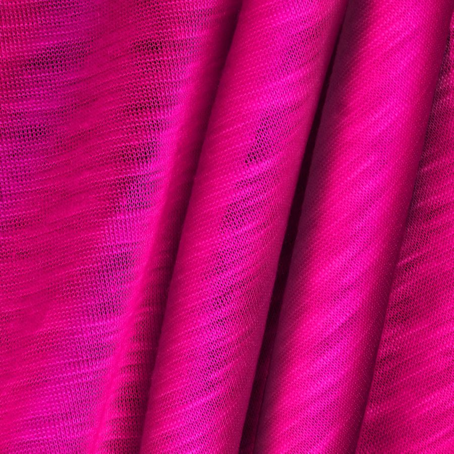 La tela base de este tejido es Punto Camiseta Jaspeado - Dubái compuesta 100% de poliéster, con un gramaje de 135 gr/m2 y un ancho de 160 cm. El color liso impreso es rosa fucsia con una combinación de tinta cian de 0, magenta de 93, amarillo de 7 y negro de 0, reflejando un CMYK de 0 93 7 0. Este color secundario presenta una simbolización de amor, pasión y creatividad, y su combinación con otros colores como el azul y el blanco ofrece una imagen fresca y moderna. Cabe destacar que este tejido está impreso con el color liso a una sola cara por impresión digital textil.