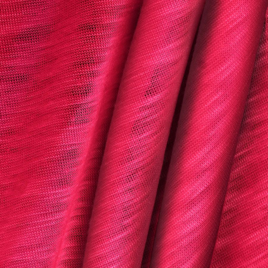 La tela se imprime con el color liso a una sola cara por impresión digital textil, lo que significa que el color se aplica únicamente en una cara de la tela y no penetra en las fibras como en el caso de una tela tintada. La textura de la tela es lisa, visualmente translúcida y jaspeada, con un tacto suave y elástico, lo que la hace ideal para prendas de punto para hombres y mujeres, especialmente camisetas.