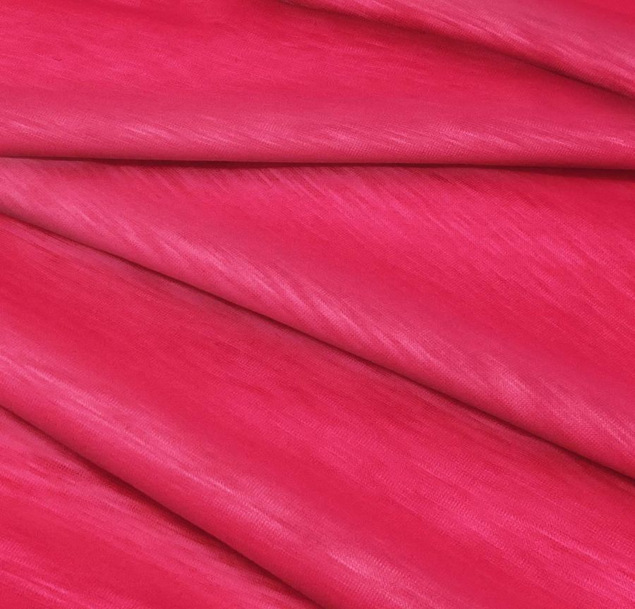 La tela base, Punto Camiseta Jaspeado - Dubái, es una tela de punto con una composición del 100% de poliéster y un gramaje de 135 gr/m2, con un ancho de la tela de 160 cm. Su color liso impreso es rosa-rojizo, con un CMYK de 0 90 51 0. Este color secundario se describe como vibrante y cálido con una sensación de energía que combina bien con tonos amarillos y verdes.