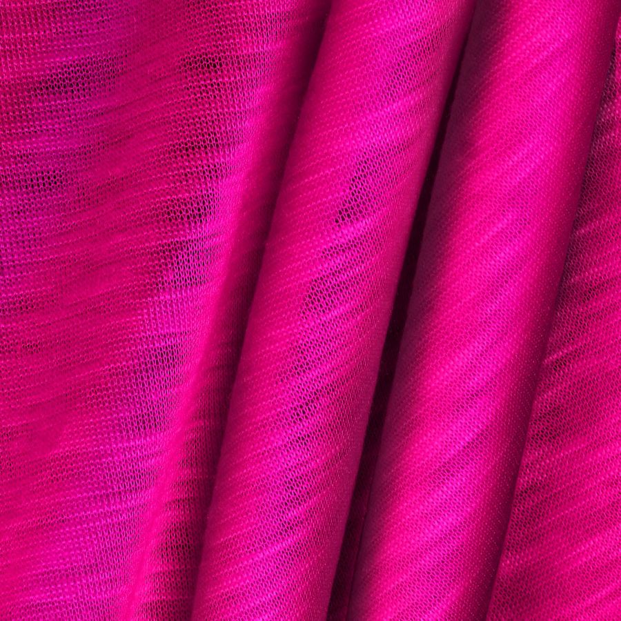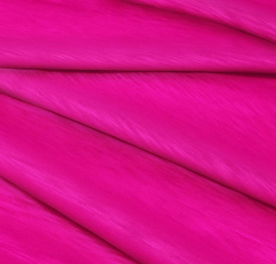 La tela base es el Punto Camiseta Jaspeado - Dubái, compuesta de 100% poliéster con un gramaje de 135 gr/m2 y un ancho de 160 cm. El color liso impreso es Rosa Brillante, con una tinta cian de 0, magenta de 93, amarillo de 8 y negro de 0, por lo que su CMYK es 0 93 8 0. Este color secundario se presenta como un tono fuerte y llamativo que combina muy bien con tonos cálidos y también con tonos fríos como azul o verde.