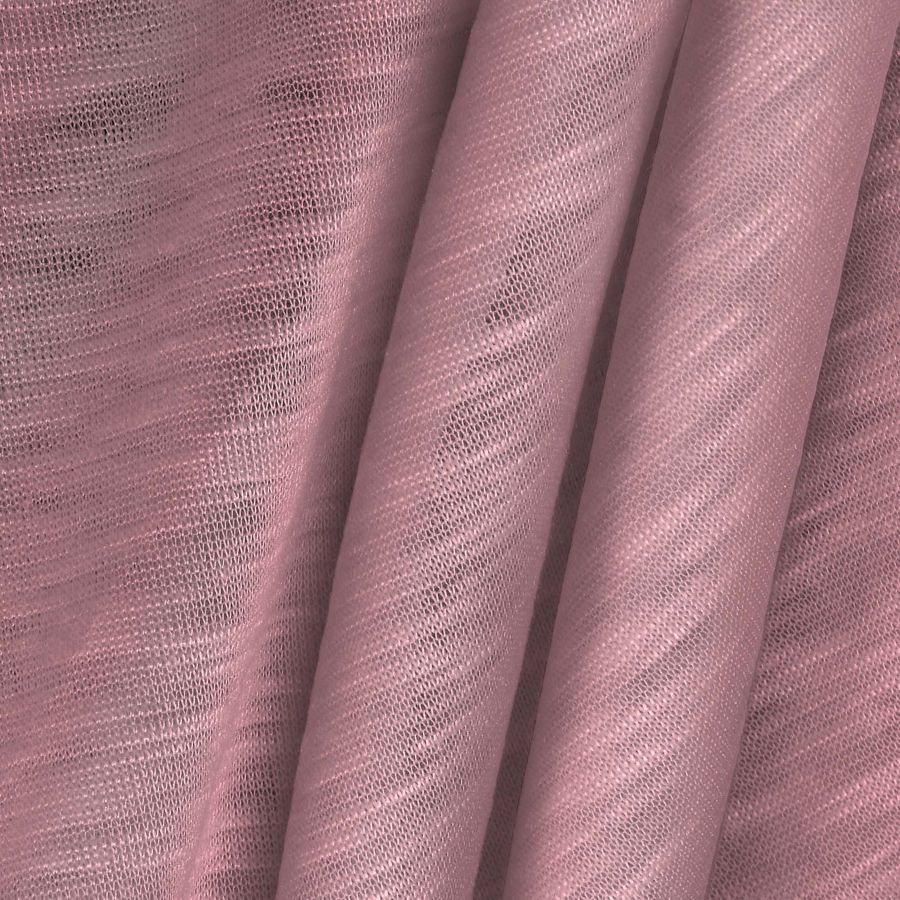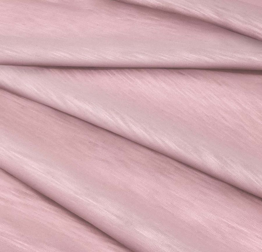 La tela base es Punto Camiseta Jaspeado - Dubái, una tela de punto de 100% poliéster con un gramaje de 135 gr/m2 y un ancho de 160 cm. El color liso impreso es rosa claro, con una composición de tinta CMYK de 0 39 13 0. Este color transmite una sensación suave, delicada y cálida que se complementa bien con colores neutros como el blanco y el beige, y también con tonalidades más fuertes como el verde limón y el morado.