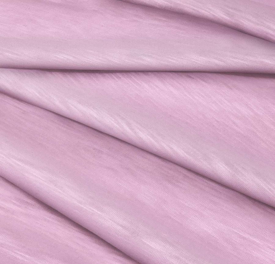 La tela base, Punto Camiseta Jaspeado - Dubái, está compuesta por un 100% de poliéster y tiene un gramaje de 135 gr/m2, con un ancho de 160 cm. Su color liso impreso es un rosa claro cálido, cuyo CMYK es de 0 40 0 0, siendo el magenta el color predominante. Este tono simboliza la dulzura y la delicadeza, y se combina fácilmente con tonos neutros como el blanco, el gris y el negro. Su textura es lisa y translúcida, con cierto efecto jaspeado al ojo experto, y su tacto es suave y elástico.