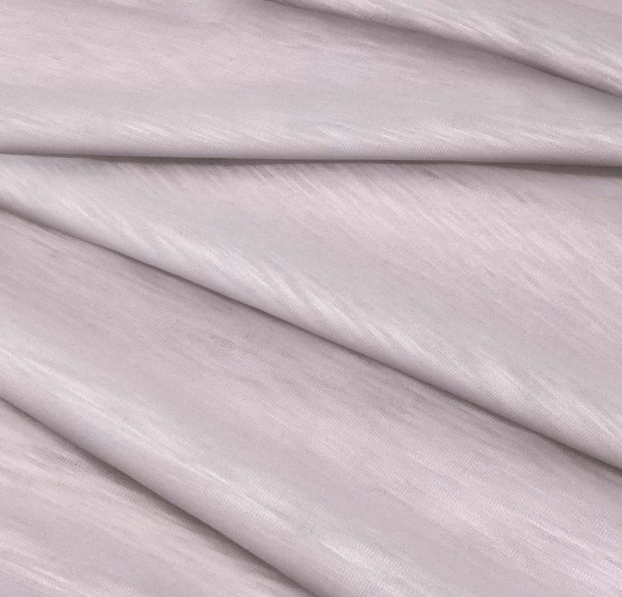 Entre las características de la tela base, podemos destacar su lisura y suavidad al tacto, así como su elasticidad. Además, presenta un acabado visual jaspeado y translúcido, lo que le da un aspecto ligero y fresco. En cuanto al color liso impreso, este presenta un contraste sutil con la base jaspeada, creando un efecto texturado interesante.
