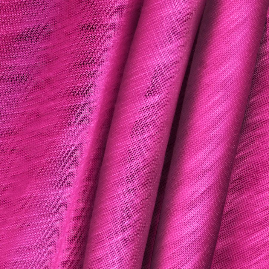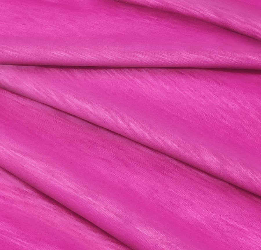 La tela base es una Tela de Punto llamada Punto Camiseta Jaspeado - Dubái, compuesta por 100% poliéster con un gramaje de 135 gr/m2 y un ancho de la tela de 160 cm. El color liso impreso es de tonalidad Rosé Bonbon, con un CMYK de 0 83 0 0, por lo que se trata de un color rosa claro con un tono pastel. Este color secundario evoca la delicadeza y la suavidad, siendo una buena opción para prendas de tonalidades suaves o estampados florales. Combina perfectamente con colores como crema, blanco, gris perla o lila.