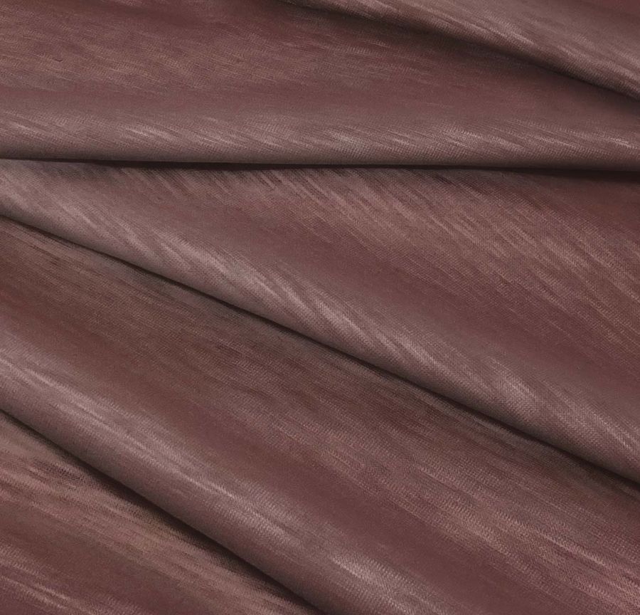 La tela base de la Punto Camiseta Jaspeado - Dubái es una tela de punto de poliéster de 135 gr/m2 y 160 cm de ancho, con una textura y tacto lisos, visual translúcida y jaspeada, y cierta elasticidad. El color liso impreso es una combinación de rosa y rosé ébano, con un CMYK de 42 60 51 0. Este color evoca la suavidad femenina con un toque de elegancia, que se combina especialmente bien con colores neutros como el gris o el beige.