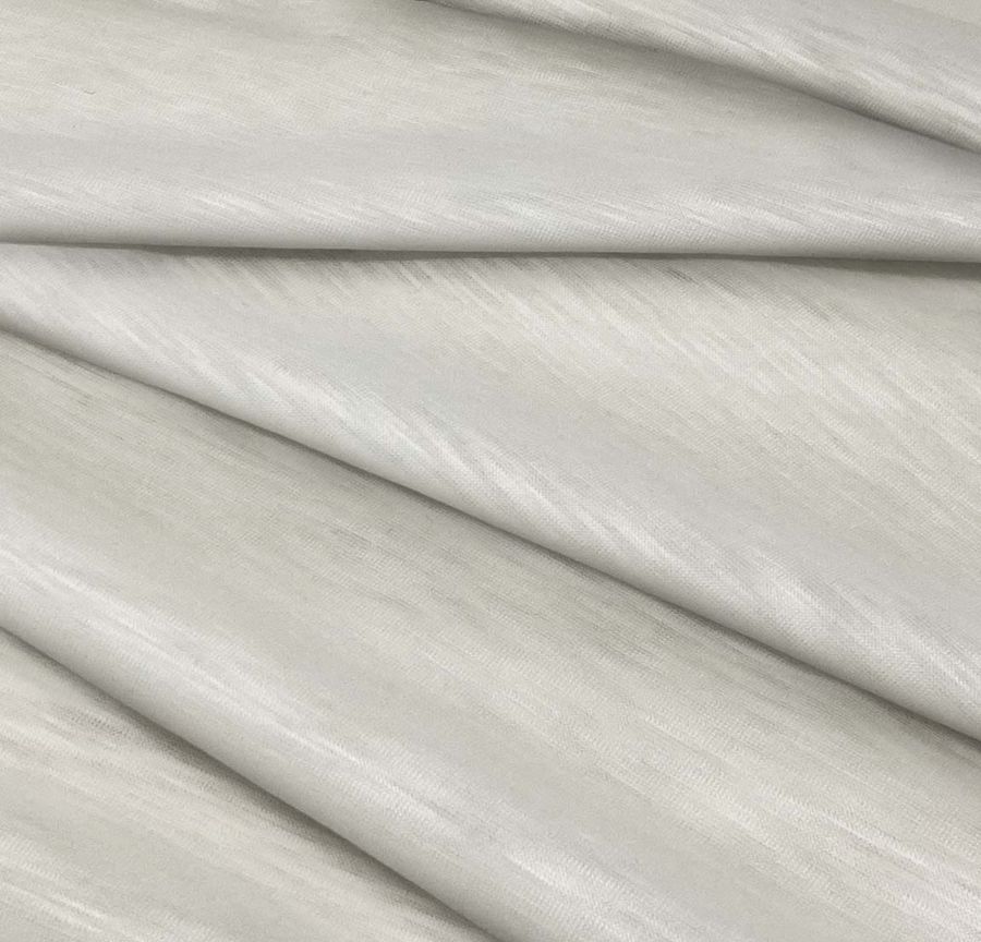La tela base es el Punto Camiseta Jaspeado - Dubái, una tela de punto hecha de 100% poliéster con un gramaje de 135 gr/m2. Su ancho es de 160 cm y se encuentra disponible en un color asta-marrón impreso en CMYK de 12 12 19 0. La tela base tiene una textura lisa y visualmente es translúcida y jaspeada, mientras que su tacto es elástico.