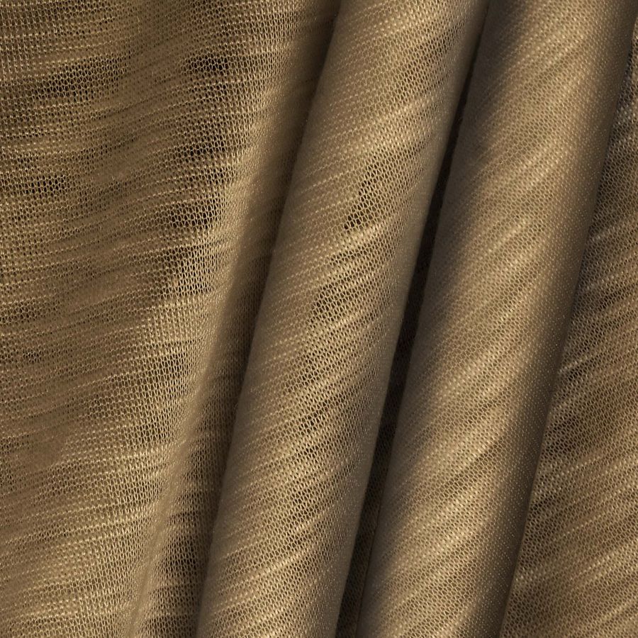 La tela base Punto Camiseta Jaspeado - Dubái es un tejido de punto de 100% poliéster con un gramaje de 135 gr/m2 y una anchura de 160 cm. Su color es Marron Bistre Francés, obtenido a través de los siguientes valores de la tinta CMYK: 38 45 65 33. Este color presenta una tonalidad marrón oscuro con sutiles tonos rojizos, que evocan la profundidad y calidez de la Tierra. El color secundario de la tela combina bien con tonos tierra, oscuros y grises, así como con tonos fríos como el azul o el verde. Es importante destacar que la tela base está impresa con el color liso a una sola cara por impresión digital textil, lo que significa que la intensidad del color puede variar ligeramente según la luz y el ángulo.