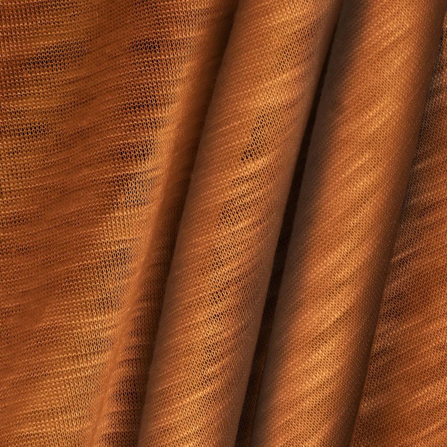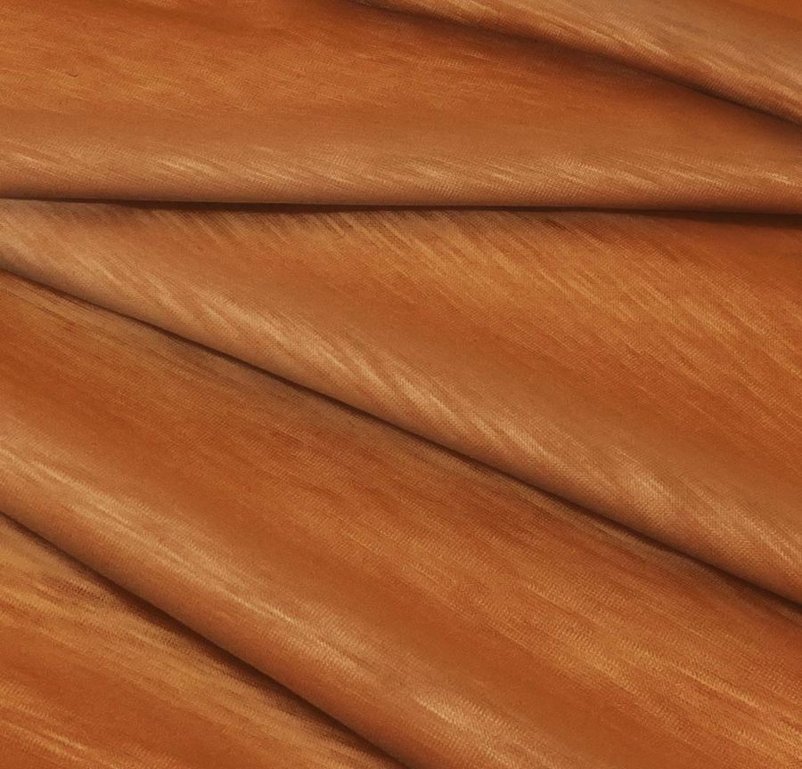 La tela base es Punto Camiseta Jaspeado - Dubái, una tela de punto 100% poliéster con un gramaje de 135 gr/m2 y un ancho de 160 cm. El color liso impreso es marrón/anaranjado, con un CMYK de 27 68 89 21, que le confiere un aspecto cálido y atractivo. Este color secundario combina perfectamente con tonalidades tierra, amarillos y naranjas.