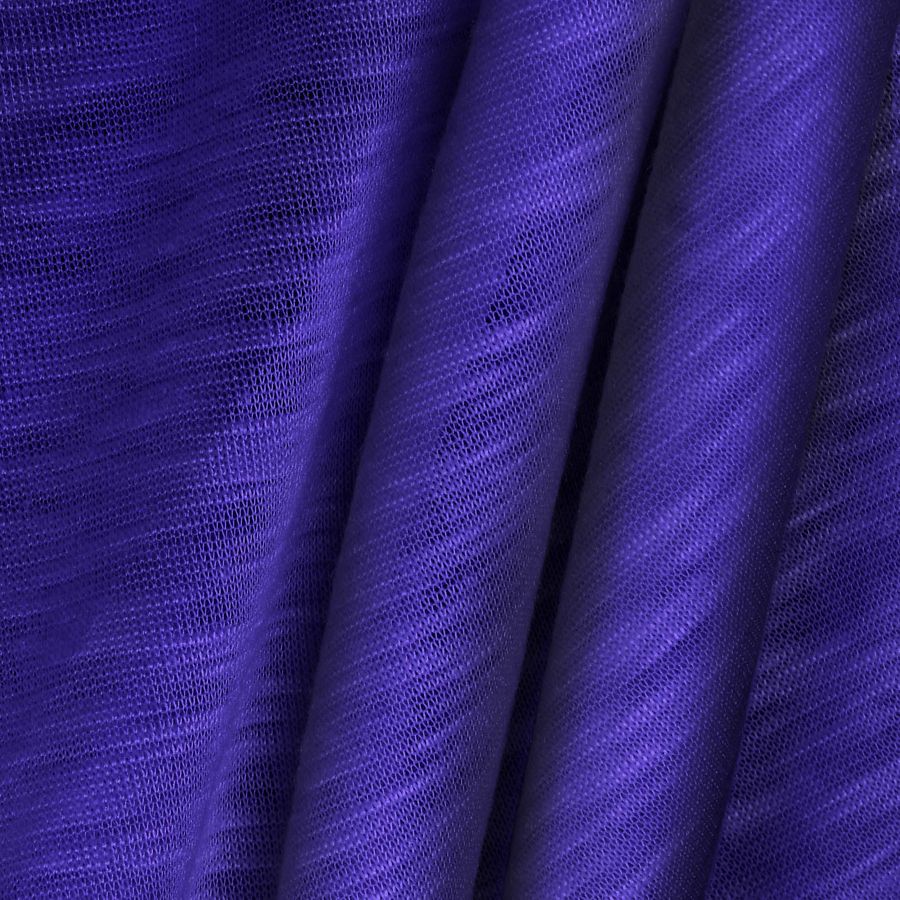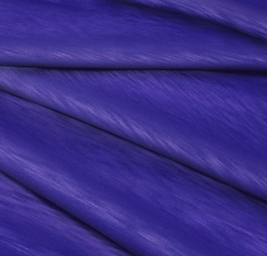 La tela base, Punto Camiseta Jaspeado - Dubái, es una tela de punto con composición 100% poliéster de gramaje ligero (135 gr/m2) y ancho estándar (160 cm). Su color liso impreso es un vibrante tono morado-azul purpureo, cuyo contenido del CMYK es de 97% de Cyan, 97% de Magenta, 5% de Yellow y 1% de Black. Este color secundario transmite una sensación de vitalidad y profundidad cromática, es muy versátil para combinar con otros tonos, como el blanco hueso o grises, que le permiten destacar aún más su tonalidad.