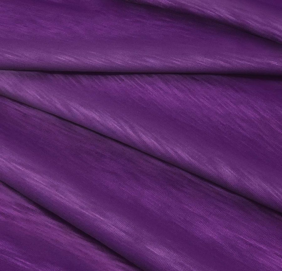 La tela base es Punto Camiseta Jaspeado - Dubái, una tela de punto compuesta por 100% poliéster con gramaje de 135 gr/m2 y ancho de 160 cm. El color liso impreso es Morado Cambur, con un CMYK de 77 100 24 16. El color es un morado oscuro que tiene cierta mezcla de marrón y rojo, lo que lo hace cálido y sofisticado. Combina muy bien con colores tierra y beige, así como con grises oscuros y negros.