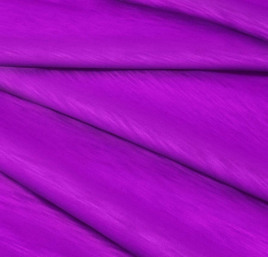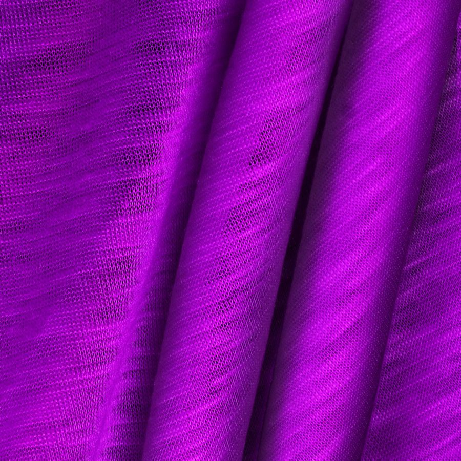 La tela tiene una textura lisa y visual translúcida y jaspeada con un tacto suave y elástico. La tela es adecuada para la confección de prendas de punto tanto para hombres como para mujeres, como camisetas. Las aplicaciones de la tela son ideales para la moda gracias a su composición y gramaje, los cuales le permiten ser una opción popular para ropa de uso diario y prendas deportivas. Además, el púrpura transmite un aire de elegancia, lo que lo convierte en una elección ideal para la ropa formal.