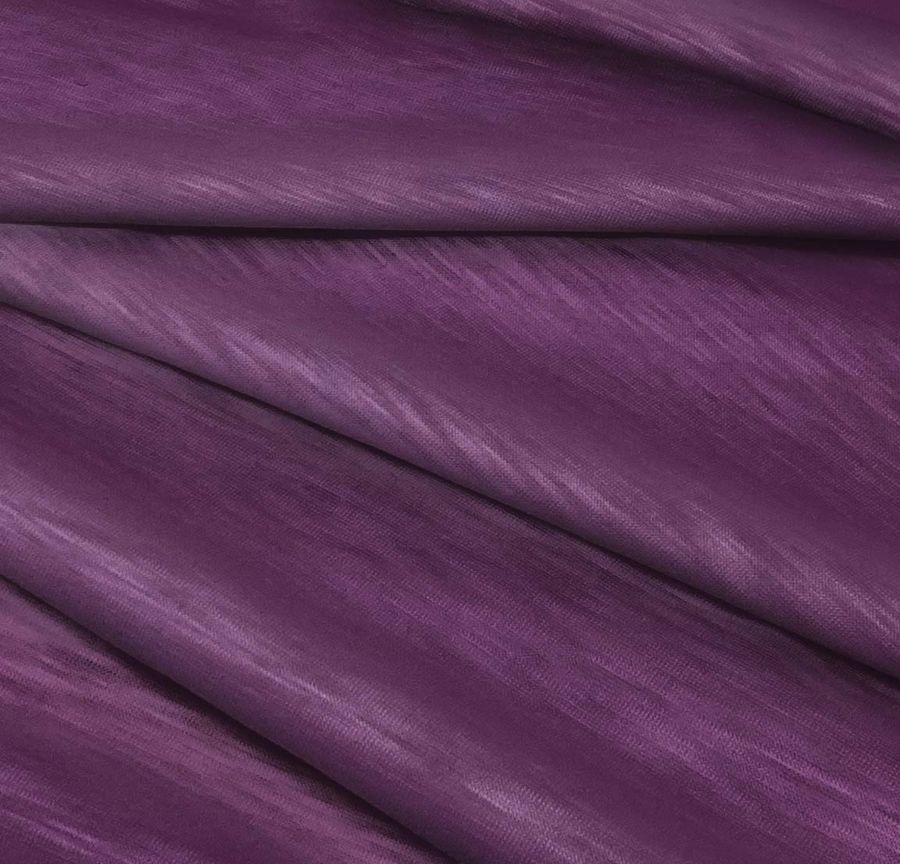 La Tela de Punto Camiseta Jaspeado - Dubái presenta un color liso impreso de Morado Violeta Japonés, con una combinación de tintas de 66 de Cyan, 84 de Magenta, 35 de Yellow y 32 de Black (CMYK: 66 84 35 32). Este color secundario evoca la tranquilidad, serenidad y elegancia, en combinación con otros colores como el blanco, el negro, el gris y el rosa pastel. Es importante mencionar que el tejido está impreso con el color liso a una sola cara por impresión digital textil, lo que garantiza una alta calidad y resolución de la imagen impresa.