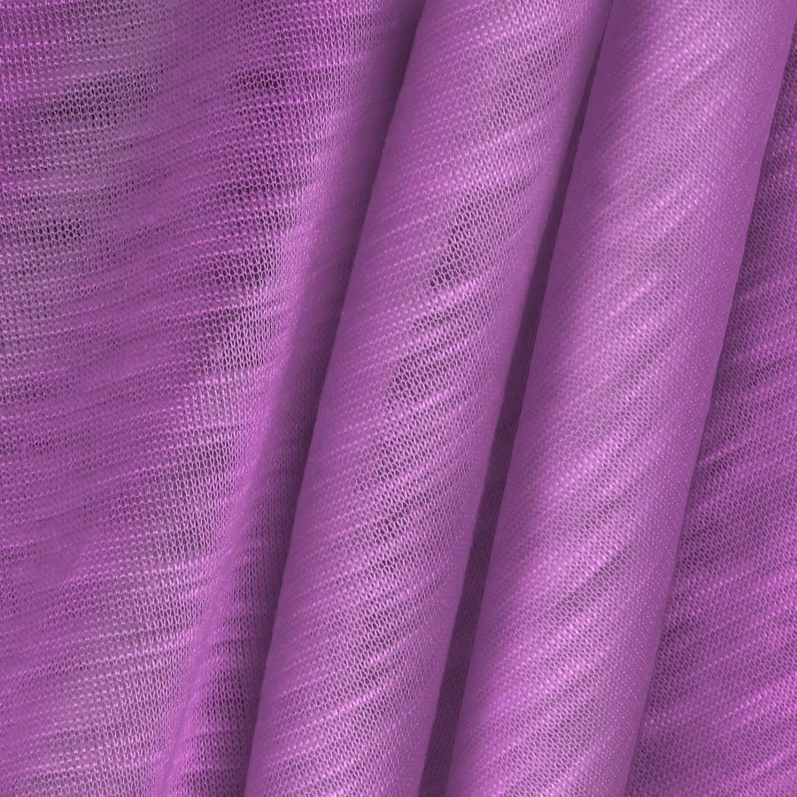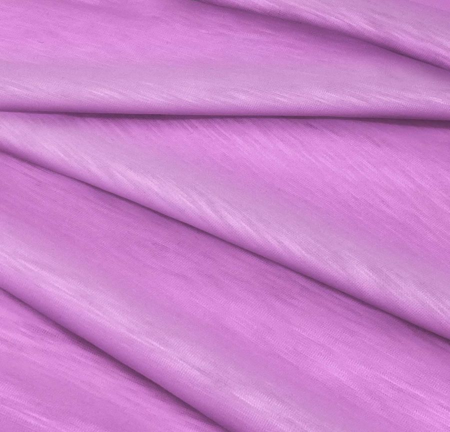 La tela base es la Punto Camiseta Jaspeado - Dubái, una tela de punto de poliéster con un gramaje de 135 gr/m2 y un ancho de 160 cm. El color liso impreso es un Morado-Violeta web, reflejado en el CMYK (25, 55, 0, 0). Este color se caracteriza por ser intenso, con un tono secundario que aporta cierta profundidad y sofisticación. Destacan especialmente sus tonos cálidos que la hacen combinable con colores similares, así como también con tonalidades más frías como el azul o el verde.