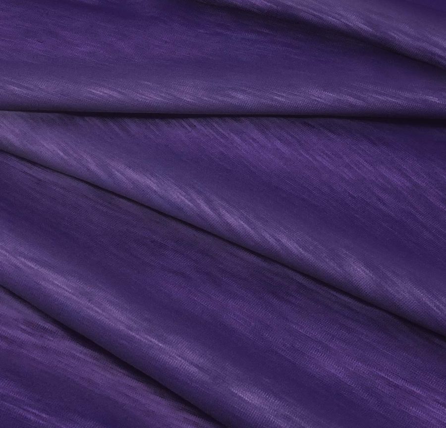 La tela base, Punto Camiseta Jaspeado - Dubái, tiene una composición del 100% POLIÉSTER y un gramaje de 135 gr/m2, con un ancho de 160 cm. Su color liso impreso es Morado y Violeta Ultramar, con un CMYK de 88 94 29 24. Este color además de transmitir serenidad y elegancia, combina muy bien con otros tonos como el gris y el azul oscuro.