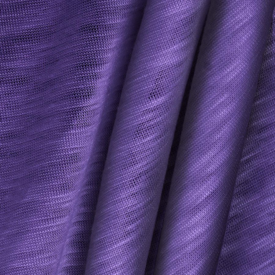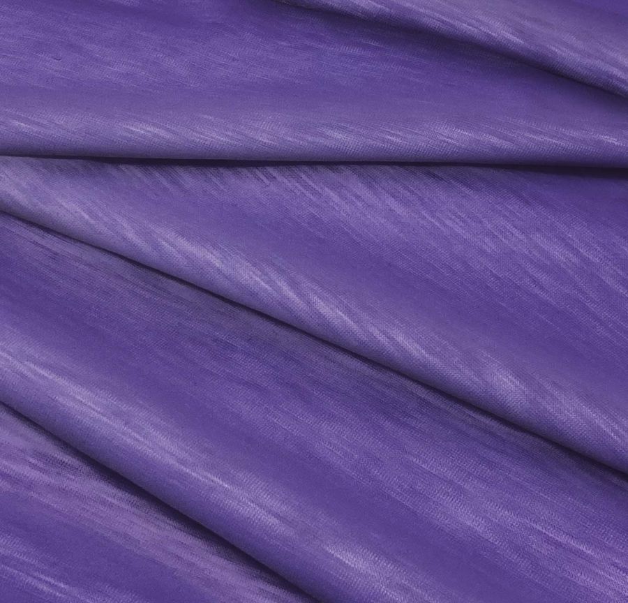 La tela base es Punto Camiseta Jaspeado - Dubái, de composición 100% POLIÉSTER, con un gramaje de 135 gr/m2 y un ancho de 160 cm. El color liso impreso es Morado, en un tono Violeta Cristal, que se compone de la siguiente manera: Tinta Cyan 75, Tinta Magenta 77, Tinta Yellow 14 y Tinta Black 2, correspondiendo a un CMYK de 75 77 14 2. Además de este color principal, se pueden apreciar sutiles tonalidades jaspeadas, propias de la tecnología de sublimación empleada en la impresión de la tela.