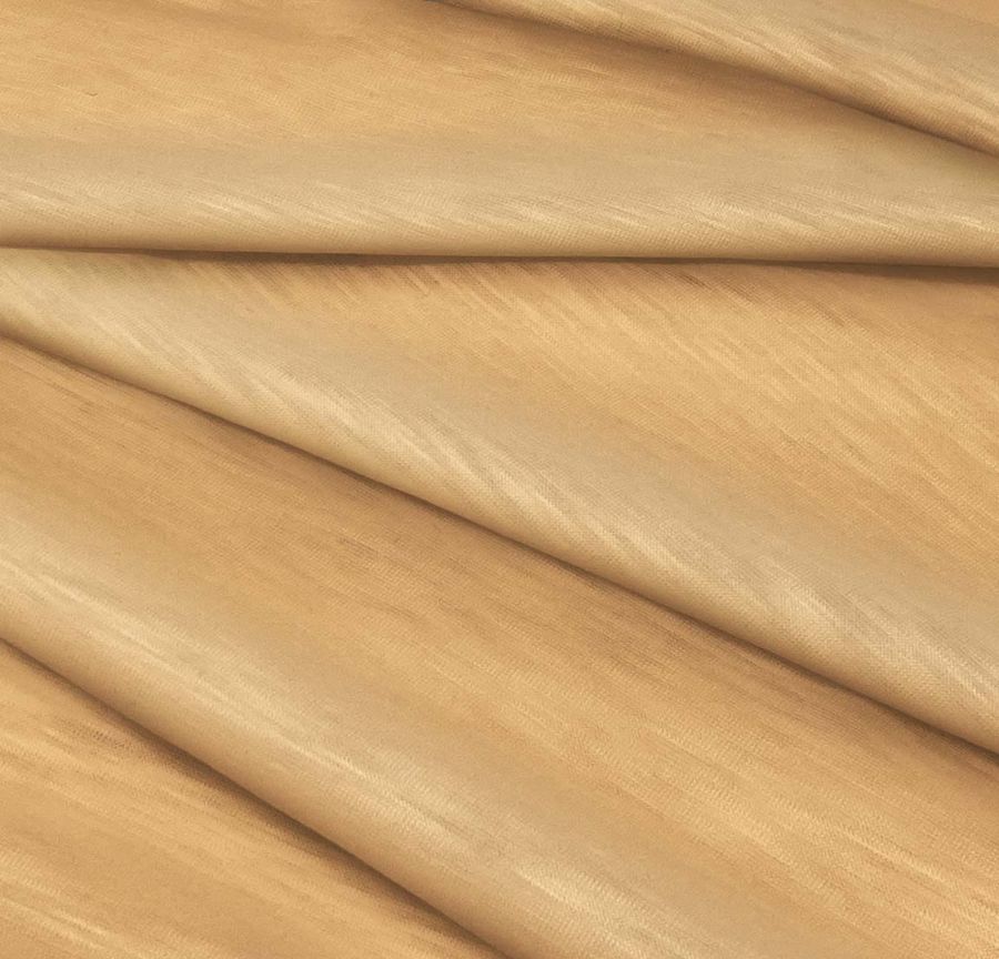 El tejido está impreso con el color naranja mandarina claro a una sola cara por impresión digital textil, lo que significa que no es un tejido tintado sino impreso por una sola cara. La tela tiene una textura y tacto lisos, visual translúcido y jaspeado, y es elástica, lo que significa que tiene cierta flexibilidad.