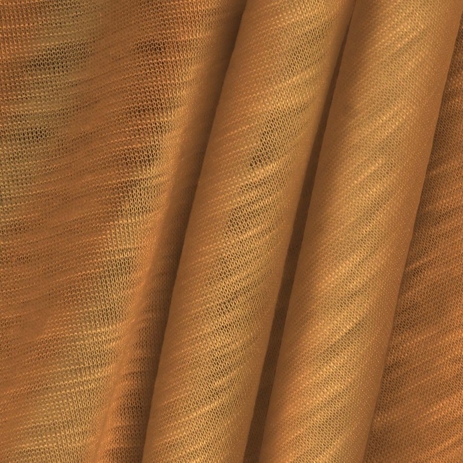 La tela base es la Punto Camiseta Jaspeado - Dubái, un tejido de punto compuesto al 100% de poliéster, con un gramaje de 135 gr/m2 y un ancho de 160 cm. Su color liso impreso es Naranja Mango Tango, con una combinación de tintas CMYK de 0 49 73 0.