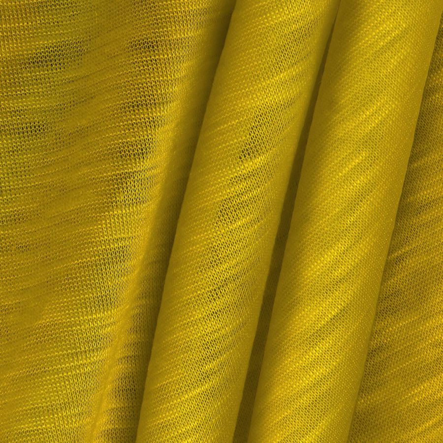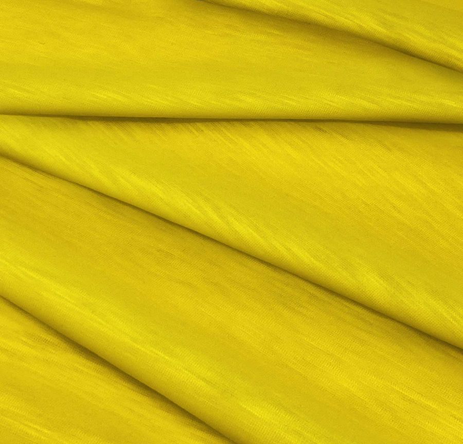 Este color secundario se puede describir como un amarillo vibrante con un toque metálico. La sensación de brillo se debe a la presencia del cromo en la mezcla de tintas, que añade un efecto de luminosidad al color final. Esta mezcla de tintas le da al tejido una textura lisa y translúcida, mientras que su textura jaspeada le da un toque de movimiento y dinamismo. La tela base es elástica y suave al tacto.