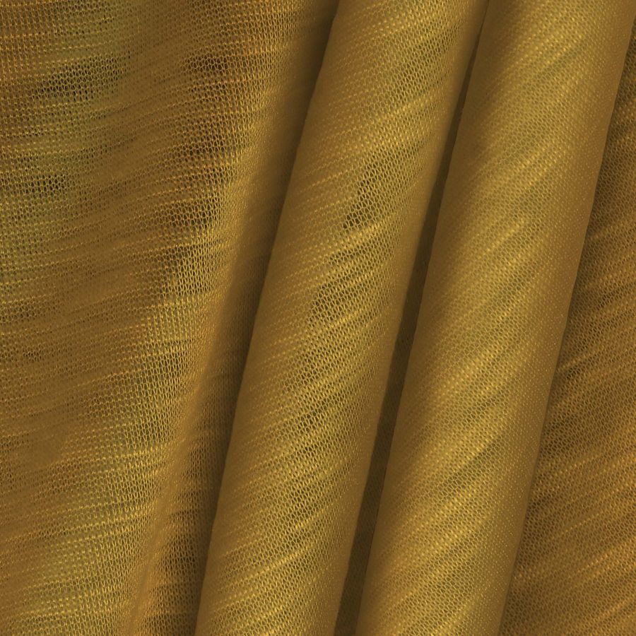 La tela base, Punto Camiseta Jaspeado - Dubái, es una tela de punto de 100% poliéster de 135 gr/m2 y 160 cm de ancho. En cuanto al color liso impreso, se trata de un amarillo mostaza con un porcentaje de tinta Cyan del 20, tinta Magenta del 44, tinta Yellow del 84 y tinta Black del 9, con un CMYK de 20 44 84 9. Este color es simbólicamente cálido, lleno de vitalidad y energía, así como técnica y visualmente vibrante y llamativo. Combina en particular muy bien con tonos tierra, naranjas, grises y azules.