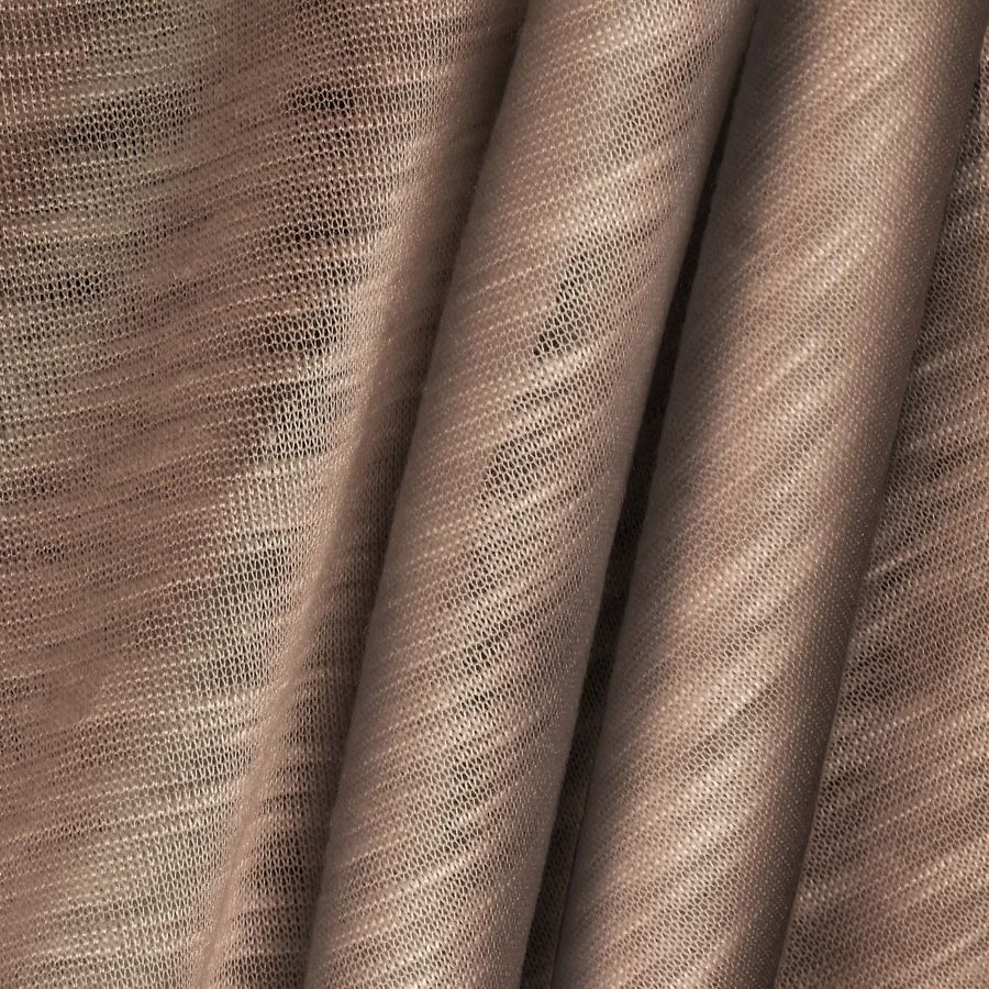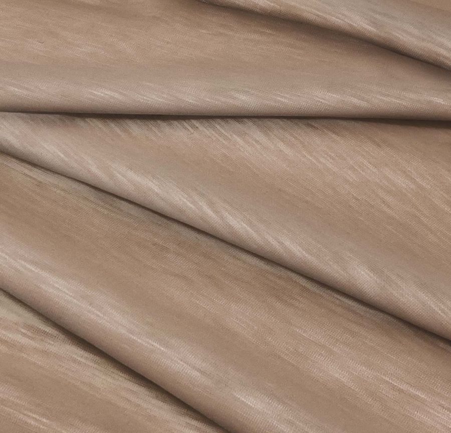 La tela base es el Punto Camiseta Jaspeado - Dubái, una tela de punto compuesta al 100% de poliéster, con un gramaje de 135 gr/m2 y un ancho de 160 cm. El color liso impreso es un marrón arcilla con los siguientes valores CMYK: 31 43 48 22. Este color se caracteriza por ser un color tierra cálido y orgánico, que evoca la naturaleza y la rusticidad. Se combina muy bien con tonos verdes, beige y dorados.