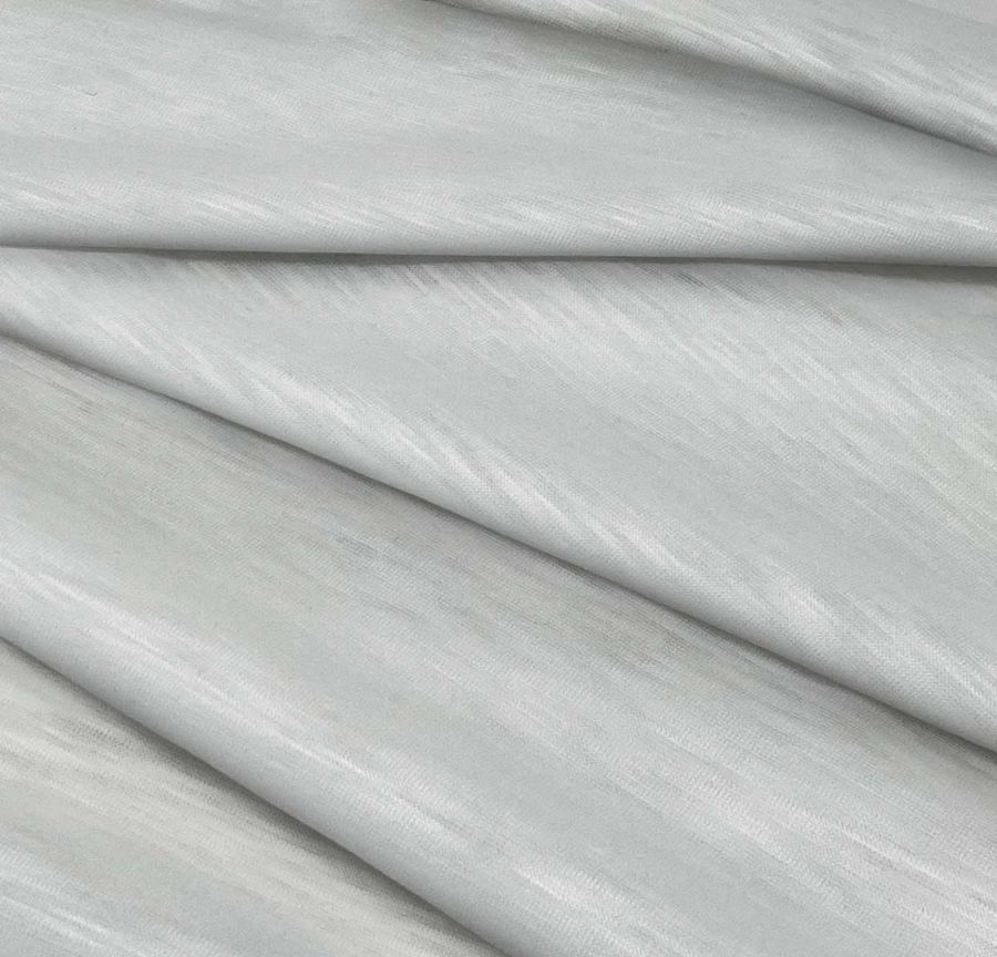 La tela base es la Punto Camiseta Jaspeado - Dubái, de tipo Tela de Punto, compuesta al 100% de poliéster, con un gramaje de 135 gr/m2 y un ancho de 160 cm. El color liso impreso es Gris Claro, con una tinta Cyan de 20, Magenta de 15, Yellow de 16 y una tinta Black de 0, cuyo CMYK es 20 15 16 0. Este color simboliza la calma, la elegancia y la serenidad, y se combina muy bien con tonos pastel, diversos tonos de azul, amarillo y colores tierra.