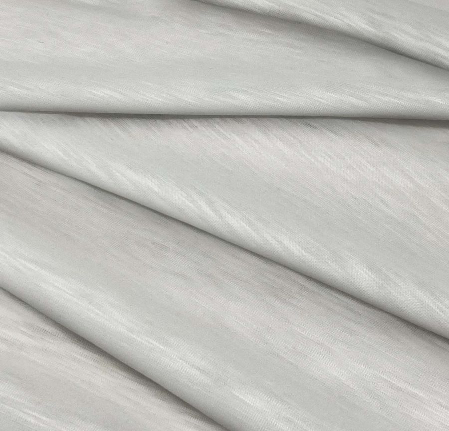 La tela base es suave al tacto y posee una textura visual jaspeada debido a su tejido de punto, lo que la convierte en una tela translúcida y elástica. Por otro lado, el color liso impreso es opaco, pero conserva la suavidad al tacto y la textura lisa de la tela base. El tejido está impreso con el color liso a una sola cara por impresión digital textil, lo que garantiza una alta calidad de imagen y color.