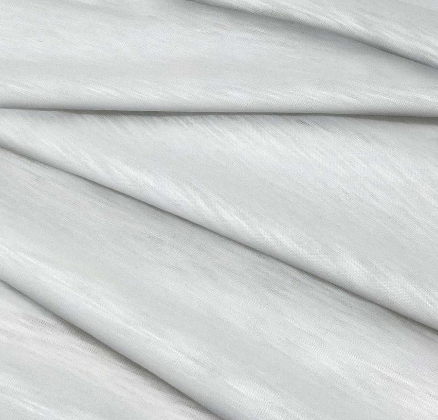 La textura de la tela base tiene un tacto suave y elástico, es visualmente translúcida y jaspeada. El color impreso, por otro lado, se caracteriza por una gran opacidad y un aspecto completamente liso. La tela es adecuada para la confección de prendas de moda tanto para mujer como hombre, especialmente para camisetas. También es apta para utilizarse en cualquier temporada del año.
